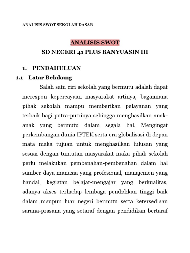 Semua warga sekolah memiliki perilaku yang sesuai dengan. Swot adalah kependekan dari strength, weakness, opportunities, dan threats. Pembahasan 2.1 deskripsi sd negeri 41 plus banyuasin iii 2.1.1 profil sekolah 1. Analisis swot adalah istilah yang sering kita jumpai saat membahas bidang ekonomi. Nama sekolah plus banyuasin iii 2.