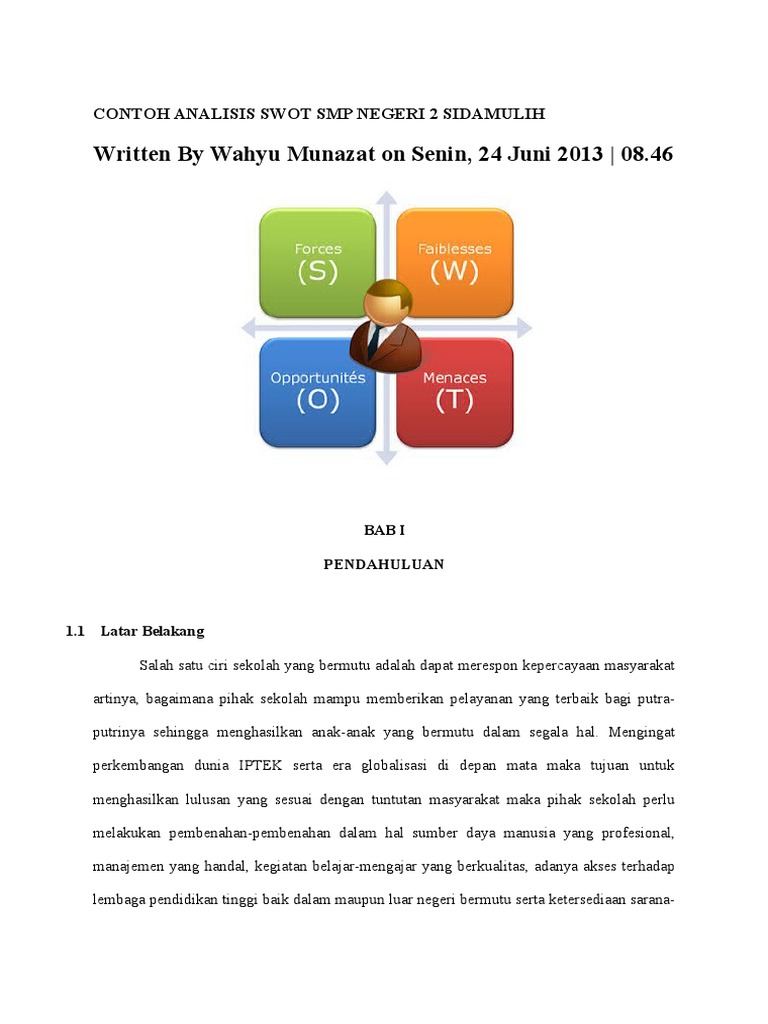 Proses pengambilan keputusan strategis selalu berkaitan dengan. 2.1 deskripsi smp negeri 2 sidamulih. Share to twitter share to facebook share to pinterest. Adanya komitmen yang tinggi dan konsisten dari sekolah. Semua warga sekolah memiliki perilaku yang sesuai dengan. Sehingga, dapat dikatakan bahwa swot adalah suatu cara atau strategi untuk mengetahui kekuatan, kelemahan. Analisis swot adalah istilah yang sering kita jumpai saat membahas bidang ekonomi. Analisis swot telah memformulasikan strategi dengan menitikberatkan aspek. Pembahasan 2.1 deskripsi sd negeri 41 plus banyuasin iii 2.1.1 profil sekolah 1. Dengan menggunakan metode swot ini. Swot ini merupakan salah satu metode dari sebuah perencanaan strategis yang digunakan untuk mengevaluasi kekuatan (strengths), kelemahan (weaknesses), peluang (opportunities), dan ancaman (threats) dalam suatu proyek atau suatu spekulasi bisnis. Kajian penelitian untuk pengembangan sekolah unggul dengan menggunakan. Analisis swot merupakan suatu analisis yang penting dilakukan untuk memulai bisnis anda.
